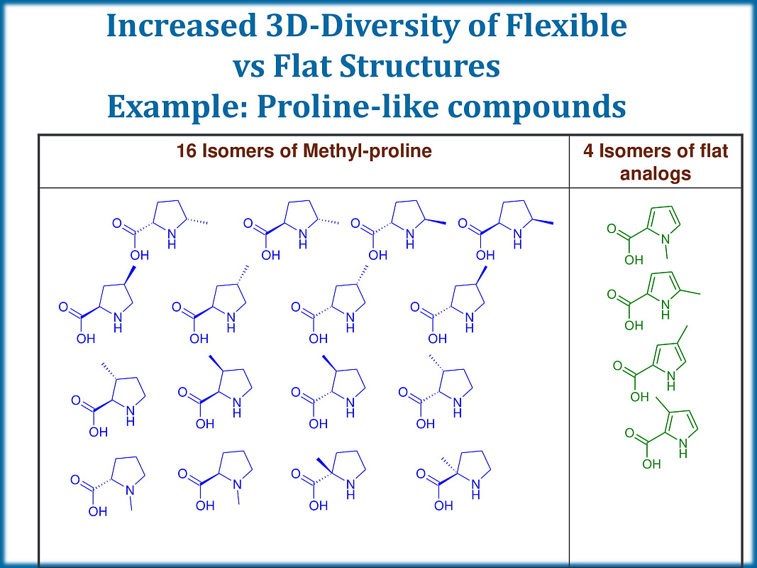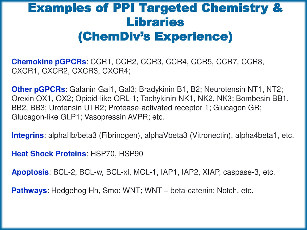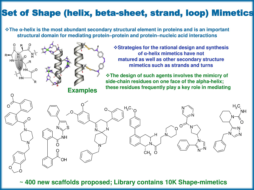 ChemDiv’s Shape Helix Mimetics PPI Library contains 9,454 compounds.Nature “sees” molecules as 3D surfaces of chemical information. Therefore the biological activity of any given molecule is intrinsically dependent upon its 3D shape.