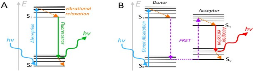 Figure 1. A Jablonski diagram illustrating the difference between fluorescence (A) and FRET (B). From ‘Fluorescent Proteins as Genetically Encoded FRET Biosensors in Life Sciences’, 2015, Hochreiter et al.