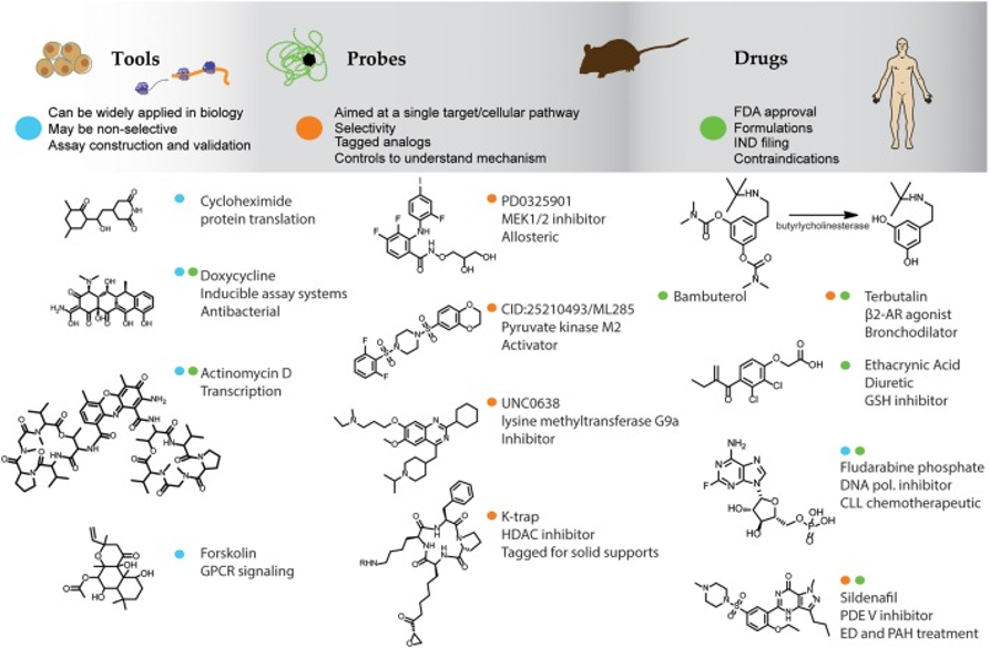 Commençons par un bref historique du développement des annotations biologiques. Les bibliothèques annotées de composés chimiques ont leurs origines en 1988, lorsque Evans et ses collègues ont proposé l'idée de former des collections de composés bio-orientés sur la base de leur activité biologique élevée [1]. Les composés de la bibliothèque annotée se répartissent en trois catégories principales : outils, sondes et médicaments (Figure 1, [2]) :