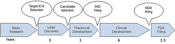 Cette brève revue se concentre sur le parcours global de découverte de médicaments (figure 1) - de l'idée à la demande de la FDA. Ces voyages prennent jusqu'à quinze ans et coûtent jusqu'à plus d'un milliard de dollars, il y a donc beaucoup à couvrir. Dans un souci de brièveté, beaucoup de choses seront mentionnées plutôt que discutées - une manière plus complète, quoique toujours concise, d'en savoir plus sur la découverte de médicaments consiste à parcourir les sources de cet article.