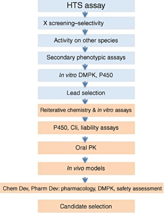 Ici, les séries de hits (groupes de hits, décidés à l'étape précédente) sont étudiées plus avant et l'efficacité est examinée dans les modèles in vivo disponibles. En règle générale, cela se traduit par des enquêtes SAR et l'utilisation de données fournies par la RMN et la cristallographie pour alimenter les techniques de modélisation moléculaire employées. Après cela, une cascade d'essais (figure 3) avec un essai à haut débit à la barre (pour éliminer les composés inactifs) fait lentement son chemin vers des étapes plus avancées avec différents essais, qui, comme indiqué ci-dessus, ne seront malheureusement pas être discuté ici.